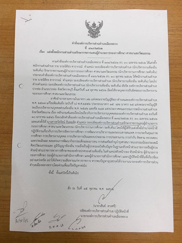 คำสั่งแต่งตั้งพนักงานส่วนตำบลรักษาราชการแทนผู้อำนวยการศึกษาศาสนาและวัฒนธรรม