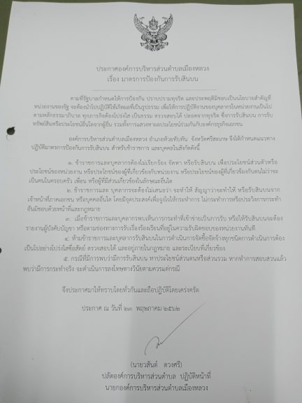 ประกาศองค์การบริหารส่วนตำบลเมืองหลวง เรื่อง มาตรการป้องกันการรับสินบน