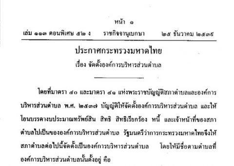 ชื่อเรื่อง : ประกาศกระทรวงมหาดไทย เรื่อง จัดตั้งองค์การบริหารส่วนตำบล