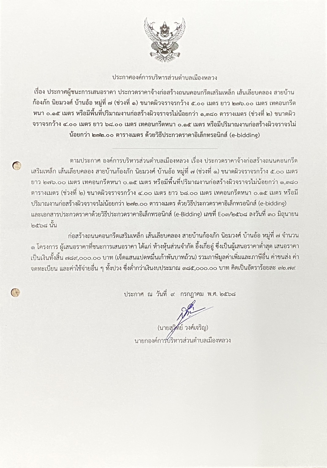 ประกาศองค์การบริหารส่วนตำบลเมืองหลวงเรื่อง ประกาศผู้ชนะการเสนอราคา ประกวดราคาจ้างก่อสร้างถนนคอนกรีตเสริมเหล็ก เส้นเลียบคลอง สายบ้าน ก้องภัก นิยมวงศ์