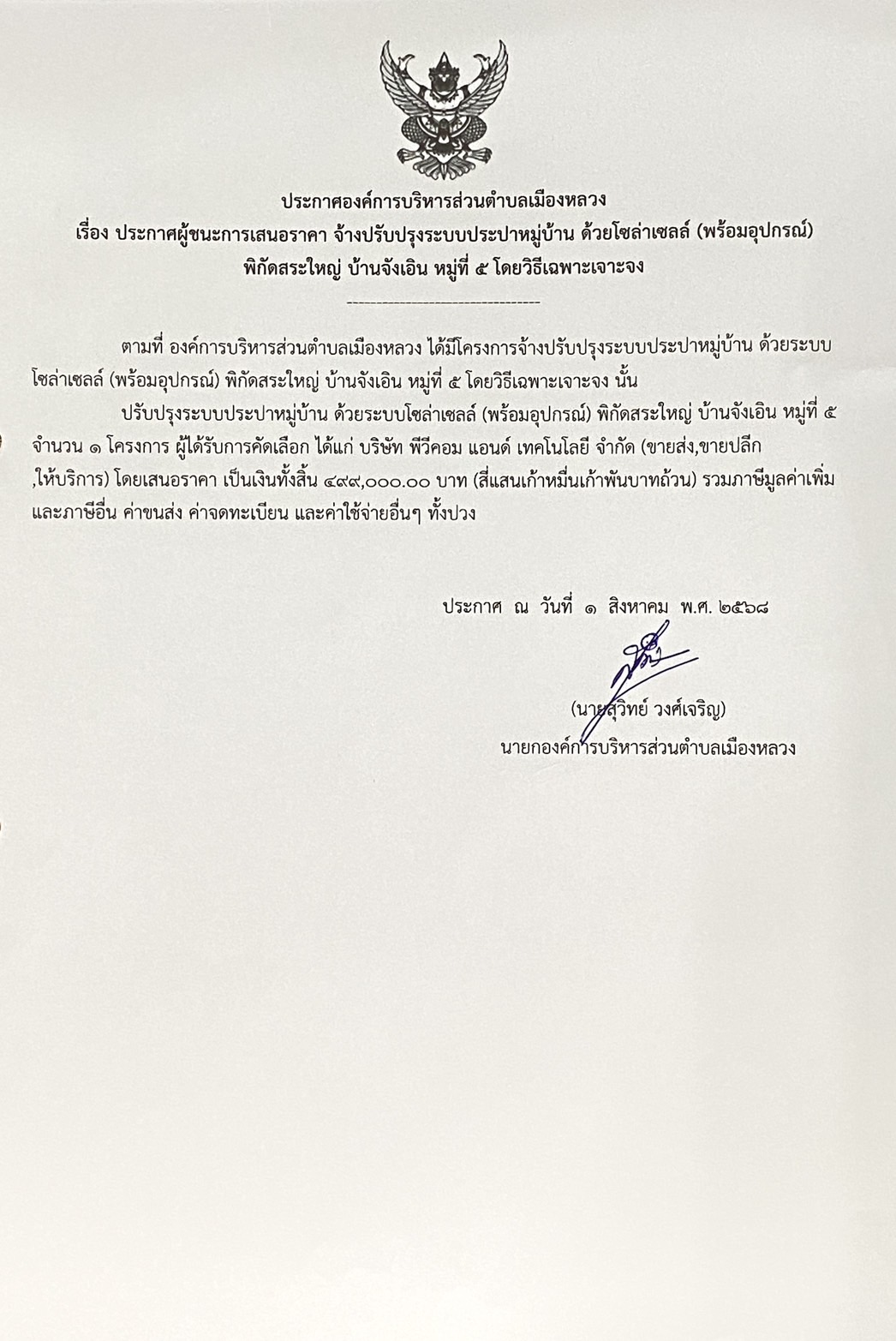 ประกาศองค์การบริหารส่วนตำบลเมืองหลวง เรื่อง ประกาศผู้ชนะการเสนอราคา จ้างปรับปรุงระบบประปาหมู่บ้าน ด้วยโซล่าเซลล์(พร้อมอุปกรณ์) พิกัดสระใหญ่ บ้านจังเ