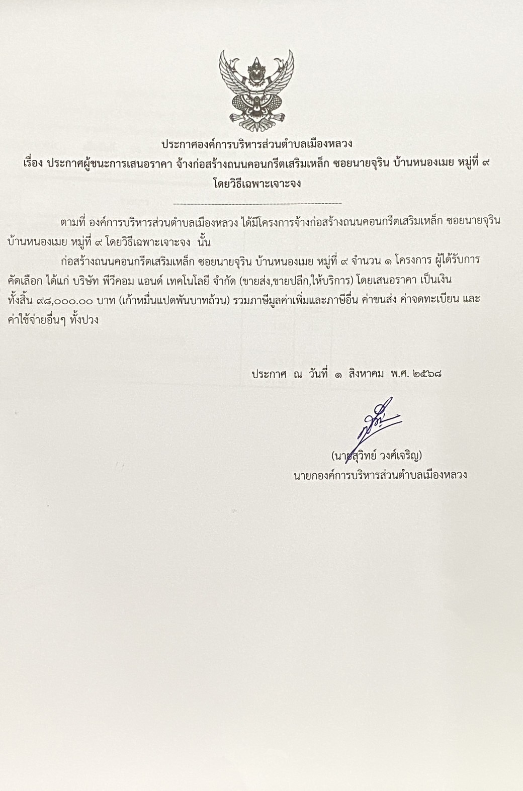 ประกาศองค์การบริหารส่วนตำบลเมืองหลวง เรื่อง ประกาศผู้ชนะการเสนอราคา จ้างก่อสร้างถนนคอนกรีตเสริมเหล็ก ซอยนายจุริน บ้านหนองเมย หมู่ที่ 9 โดยวิธีเฉพาะเจา