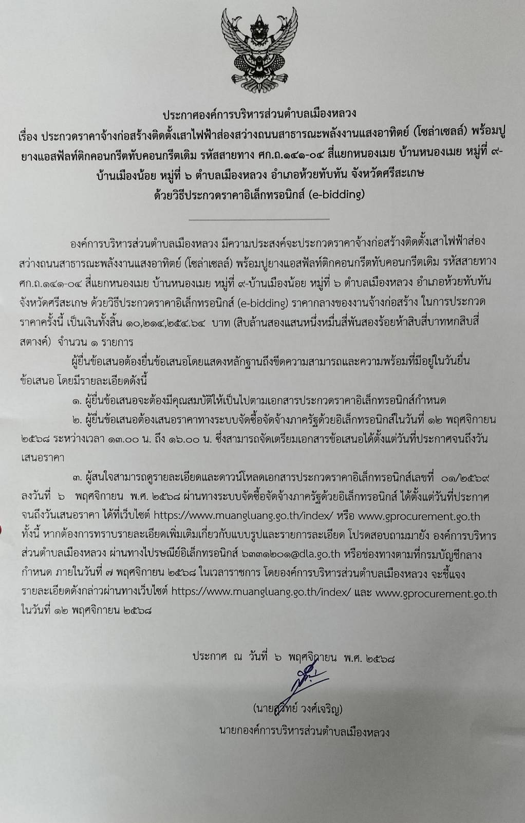ประกาศองค์การบริหารส่วนตำบลเมืองหลวง เรื่อง ประกวดราคาจ้างก่อสร้างติดตั้งเสาไฟฟ้าส่องสว่างถนนสาธารณะพลังงานแสงอาทิตย์ (โซล่าเซลล์) พร้อมปูยางแอสฟัลท